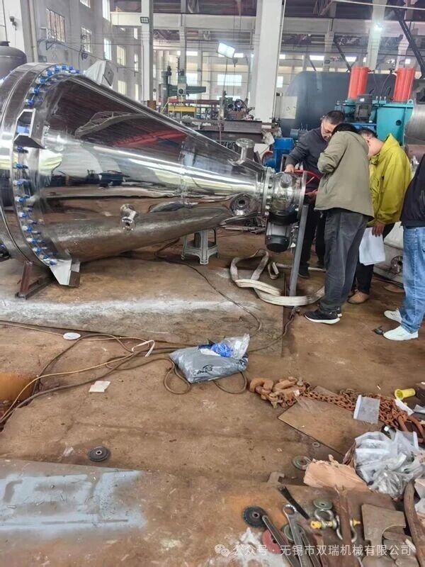 無錫雙瑞機(jī)械的裝配車間里,一臺(tái)高達(dá)4.5米的龐然大物靜靜矗立,銀色的不銹鋼外殼反射著陽光,工程師們正在對(duì)這臺(tái)專門為中石化開發(fā)的1500L單錐真空干燥機(jī)進(jìn)行出廠前的檢測。